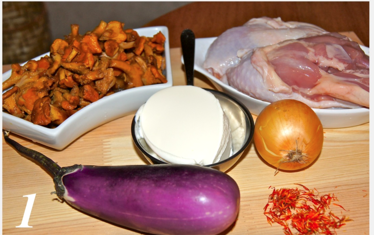 Для начала куриное мясо и баклажан стоит нарезать крупными кусочками, а лук — мелкокубиками. В разогретую сковороду с растопленным сливочным маслом выкладываются курица, баклажаны и лисички. Всё это обжаривается на среднем огне до полуготовности.