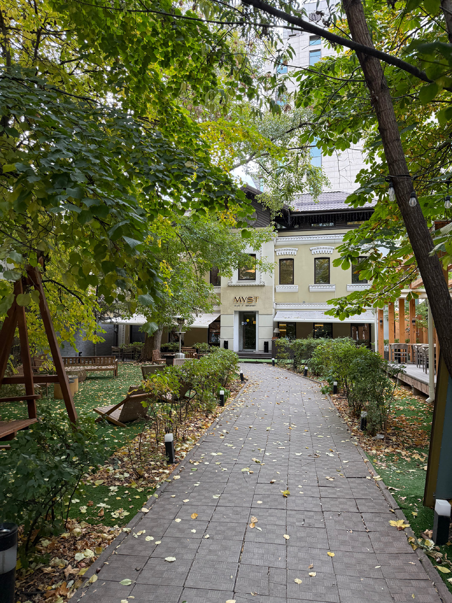 На Белорусской, в самом сердце столицы, находится удивительное заведение — ресторан Myst. Здесь открыт уютный дворик, наполненный зеленью, который преображается с каждым сезоном: от оранжево-жёлтых осенних тонов до снежных покровов зимой. При входе через кованую ограду создаётся ощущение, что вы попали в совершенно иной мир, далекий от городской суеты.