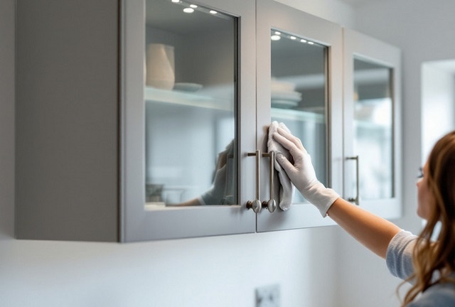 - Избегайте абразивных чистящих средств и жёстких щёток — это может повредить поверхность шкафов.