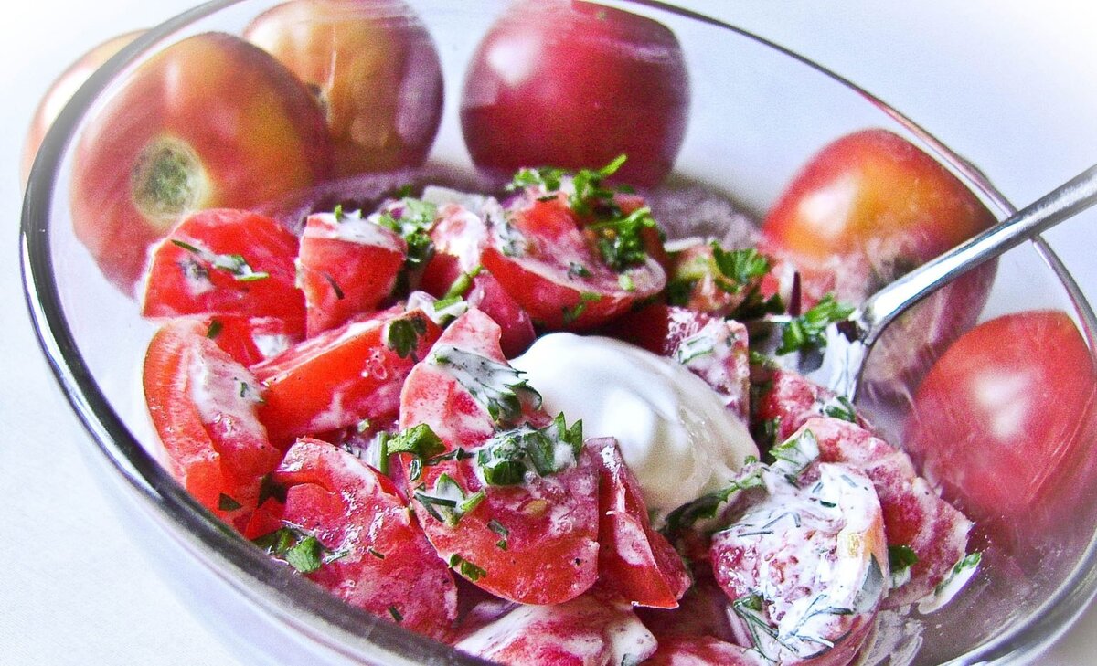 Салат из помидоров с зеленым перцем и сметаной готов! Этот освежающий и полезный блюдо идеально передает атмосферу азербайджанского лета. Если вы хотите поэкспериментировать, можно заменять зелень на свои любимые травы. Однако именно кинза и тархун придадут салату уникальный, запоминающийся вкус. Делитесь радостью лета и наслаждайтесь полезной пищей, ведь свежие овощи — это праздник стола, который, к сожалению, недолговечен. В Азербайджане такой салат называется «помидор-кешниш». Убедитесь в том, что лето принесло вам не только тепло, но и вкусное наслаждение!