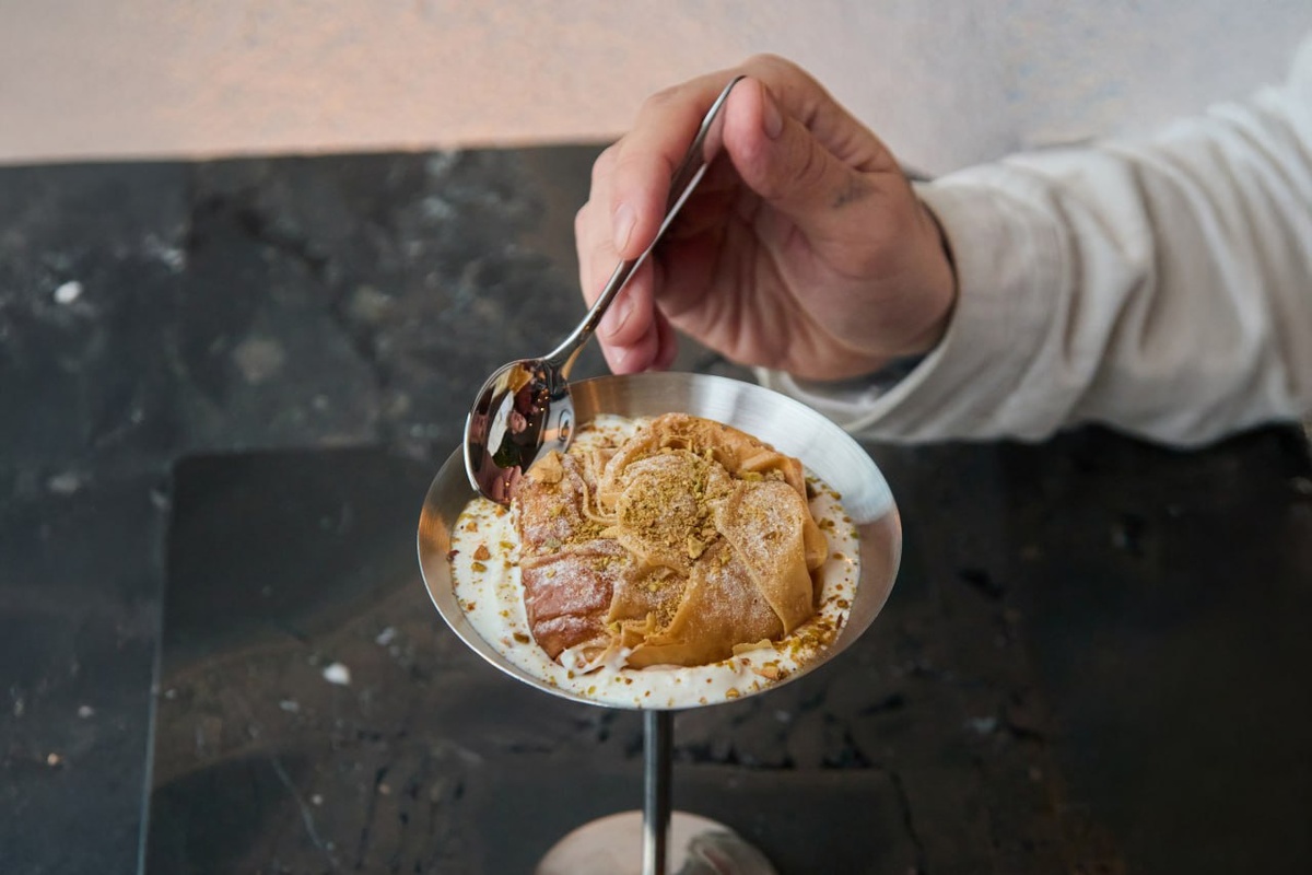 - Галактобуреко: хрустящий десерт с греческим йогуртом и фисташками. Легкий и сливочный, он идеально подходит к кофе или дижестиву.