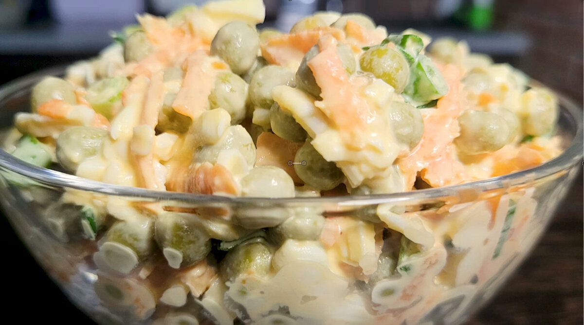 Яйца необходимо отварить и натереть на крупной терке. Все подготовленные ингредиенты помещаются в миску и заправляются майонезом или сметаной. Затем стоит добавить чеснок: вы можете использовать и сушеный, и свежий, выдавив зубчик через пресс. Завершающим аккордом станет консервированный горошек — добавьте его, перемешайте, и салат готов.