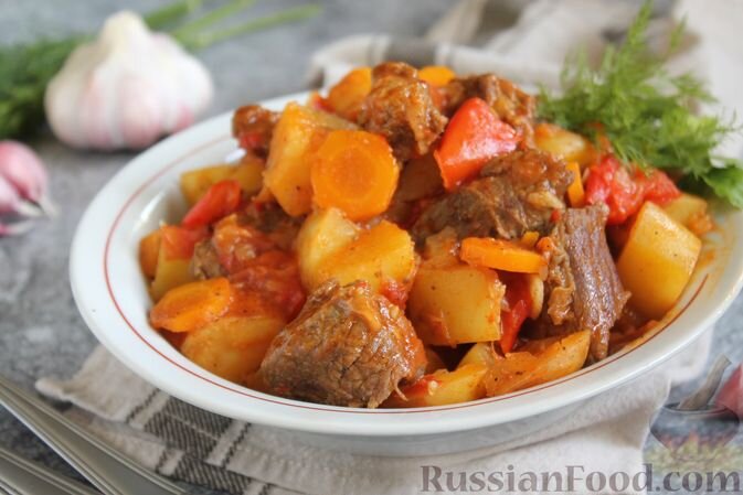 - Говядина, картофель, помидоры, сладкий перец