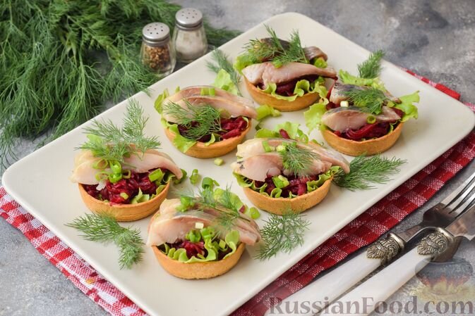 - Тарталетки со свеклой и сельдью — классическое сочетание, которое всегда в моде. Секрет в добавлении чеснока в свеклу, а для оформления отлично подойдут свежие зелени.