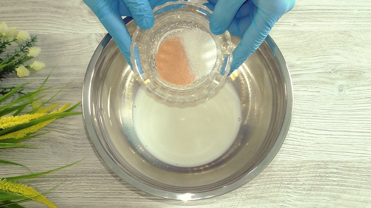 Для начала в тёплое молоко добавьте сахар и сухие дрожжи, тщательно перемешайте. Накройте миску пленкой и оставьте в тёплом месте на 5-10 минут, пока дрожжи активируются.