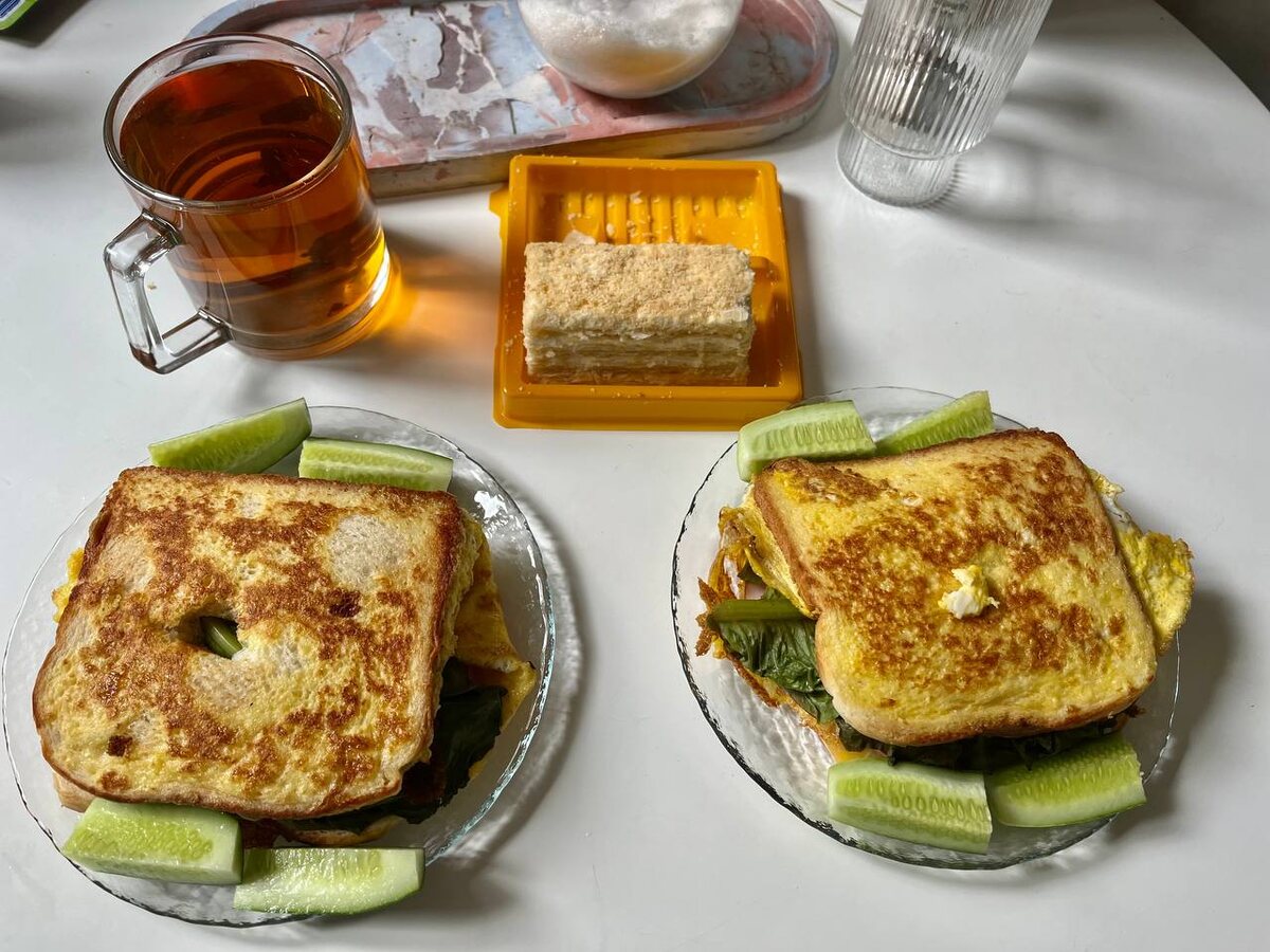На завтрак — любимые сэндвичи. Рецепт прост: взбить пару яиц, обмакнуть в них хлеб и обжарить. Когда яйца подрумянятся, добавить начинку, например, ветчину и сыр, и довести до готовности под крышкой. Дополнительно к блюду — кусочек любимого десерта.