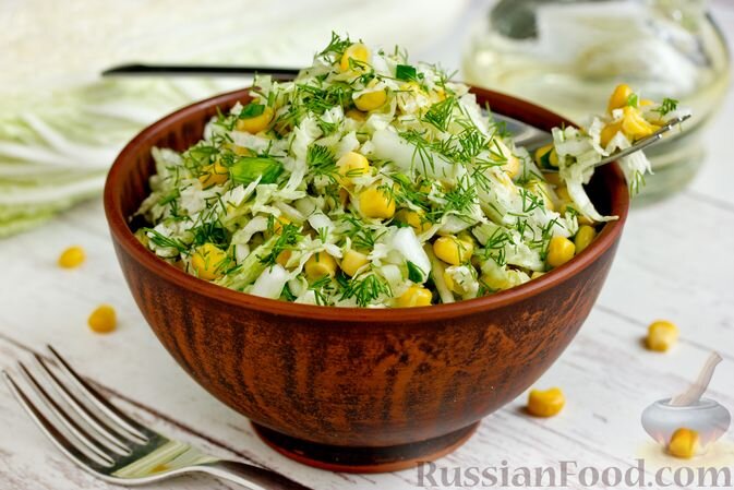 - Салат с кукурузой и зеленью. Соковыжимая свежесть пекинской капусты отлично сочетается с нежной консервированной кукурузой и зеленью. Такой салат станет отличным дополнением к любому обеду и порадует любителей легкой пищи.