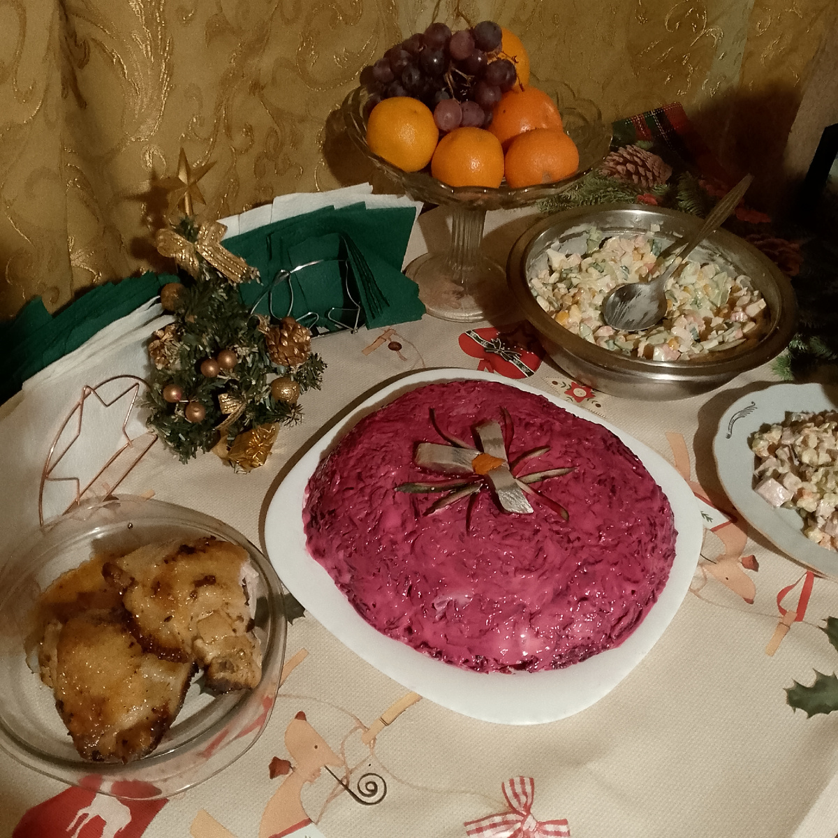 Селёдка под шубой исчезла с тарелки быстрее, чем ожидалось. Для двоих было приготовлено много вкусностей, так как гостей не планировалось. Крабовый салат с хрустящими свежими огурцами добавил разнообразия, а оставшееся Оливье стало завершающим аккордом праздника, поскольку его было приготовлено в большом количестве.