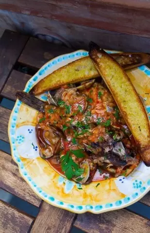 Для этого блюда подойдут любые виды рыбы, особенно если использовать комбинацию из двух-трёх различных сортов — это значительно повысит вкус.Очистить и выпотрошить рыбу, тщательно избавившись от лишних сгустков крови вдоль позвоночника и жабр.Поместить рыбу в кастрюлю, стараясь расположить её в один слой (крупные экзEMPLЯРЫ нарезать на порции, мелкие оставить целыми).Добавить белое вино и немного воды, чтобы жидкость практически полностью покрыла рыбу.Для аромата можно бросить в кастрюлю любимые специи и коренья для рыбного бульона, но и без них результат будет прекрасен.Накрыть кастрюлю крышкой, довести до кипения и готовить на медленном огне 25-30 минут.Аккуратно вынуть рыбу из бульона, а сам бульон процедить и вернуть обратно в кастрюлю.Снова поставить кастрюлю на огонь, позволяя жидкости кипеть до тех пор, пока её вкус не станет насыщеннее.В то же время на раскалённой сковороде обжарить измельчённый чеснок и лук в оливковом масле до появления приятного аромата. Затем добавить томаты (консервированные или свежие, нарезанные). Размять их ложкой на более мелкие кусочки и тушить с периодическим помешиванием.После 10-15 минут, когда объём бульона уменьшится наполовину и соус станет однородным, соединить его с бульоном в кастрюле.Всыпать мякиш от черствого хлеба и перемешать, чтобы соус загустел; регулируя количество хлеба, можно добиться нужной консистенции.Вернуть рыбу в кастрюлю, слегка прогреть в соусе и подавать, украсив свежей петрушкой и подавая с чесночными гренками и бокалом вина.Приятного аппетита!