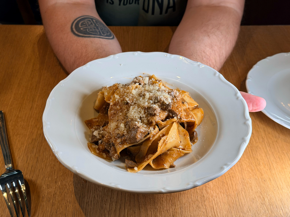 3. Паста по-деревенски с куриными потрошками (19 рублей) наверняка порадует: широкие макароны с идеальной аль денте и душистым соусом Болоньезе вызывают восхищение.