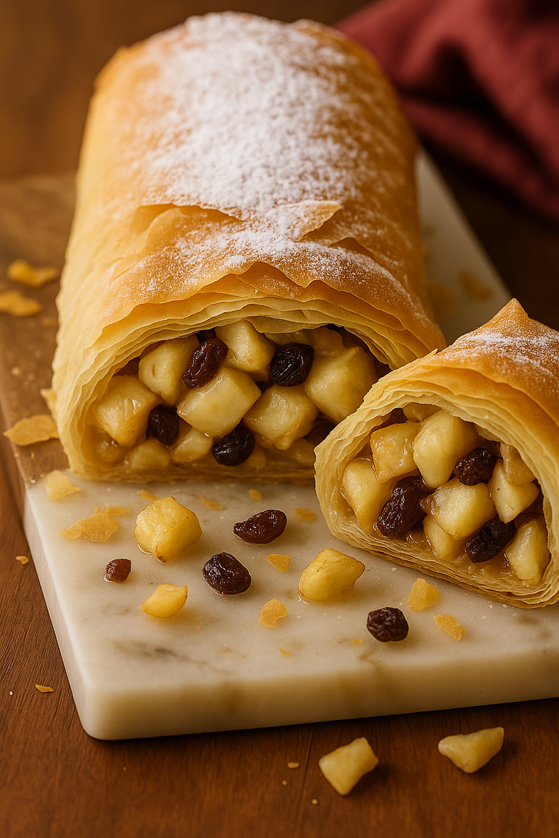 После выпекания подавайте штрудель горячим, посыпав сверху сахарной пудрой. Так вы получите идеальный десерт с нежной, румяной текстурой и незабываемым ароматом!