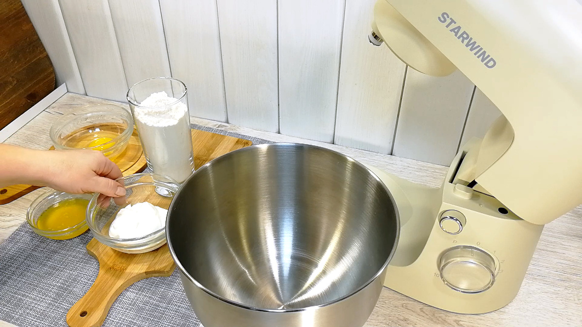 - Постепенно добавлять муку с разрыхлителем, замешивая мягкое тесто.