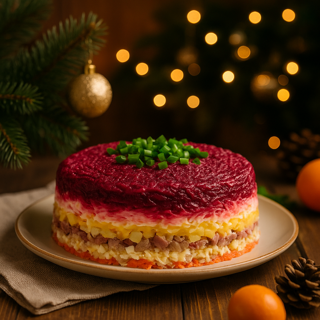 Этот салат — не просто еда, а целая симфония вкусов, напоминающая о семейных традициях и уютных праздниках. Каждый слой сильно отражает новогоднюю магию: нежный почерёк майонеза, сладость свёклы и бархатная картошка создают неповторимый ансамбль.