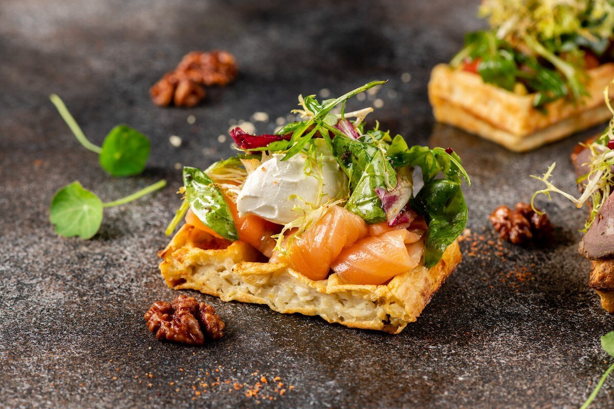 Сначала картофель следует тщательно промыть с помощью щётки, обсушить, но не очищать. Завернуть в фольгу и запекать в заранее разогретой до 180 градусов духовке примерно 40 минут, пока он не станет мягким.После запекания очистить картофель и натереть его на крупной терке. В массу добавить молоко, растительное масло, яйца, пшеничную муку, соль и молотый перец. Хорошо перемешать до получения однородной консистенции.Выложить картофельную смесь в вафельницу и готовить около 7 минут.На готовую картофельную вафлю распределить сливочный сыр, сверху красиво положить ломтики лосося, посыпать все мелко нарезанным зеленым луком и дробленым черным перцем. Блюдо лучше подавать горячим, пока вафля не остыла.