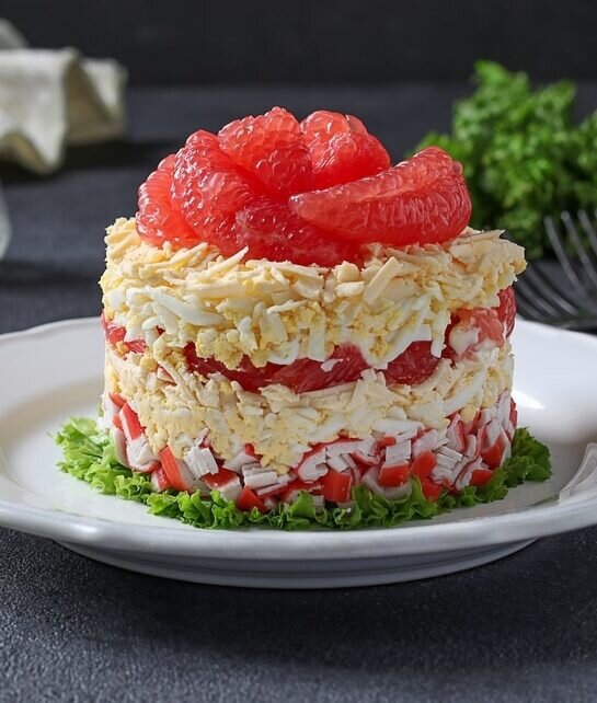 Необычный слоёный салат с крабовыми палочками и грейпфрутом
