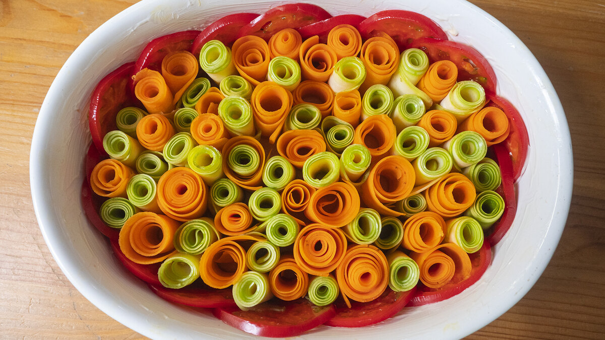 Запеканка получается невероятно вкусной, нежной и яркой. Её сытность и необычная подача приятно удивляют. Приготовление этого блюда — отличный способ развлечься с детьми: они могут помочь в создании овощных рулетиков и почувствовать себя настоящими шеф-поварами на кухне.