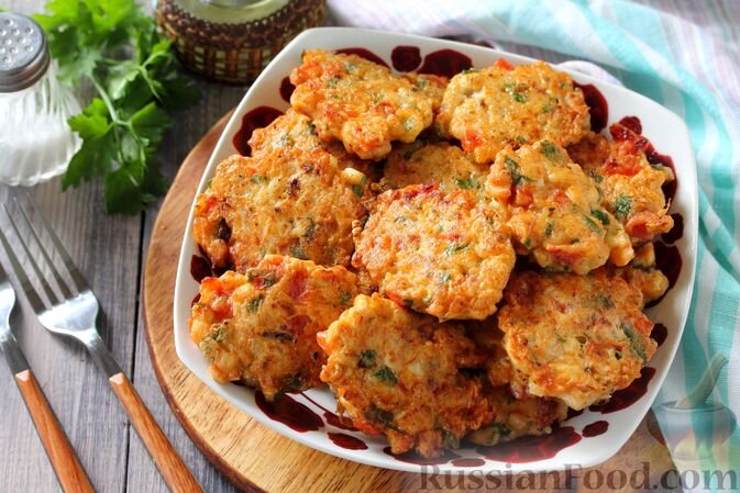 Куриные оладушки-котлеты: Нежные куриные котлеты с помидорами и зеленью готовятся легко и быстро. Их не требуется формировать вручную — достаточно выкладывать массу на сковороду ложкой, что существенно экономит время. Всего за полчаса можно получить сочные котлеты из куриного филе.