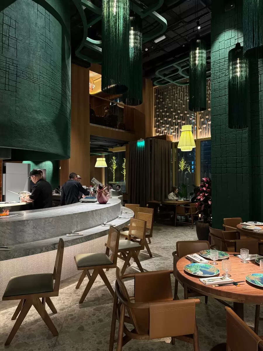 Первое, что бросается в глаза, — это обстановка. Высокие потолки и роскошный декор создают эффект просторного и элегантного пространства. Оживленная зелень, целостная сервировка и изысканная посуда делают этот ресторан отличным местом как для романтического ужина, так и для деловой встречи. Здесь комфортно и приятно находиться, создаётся атмосфера уюта и расслабленности.