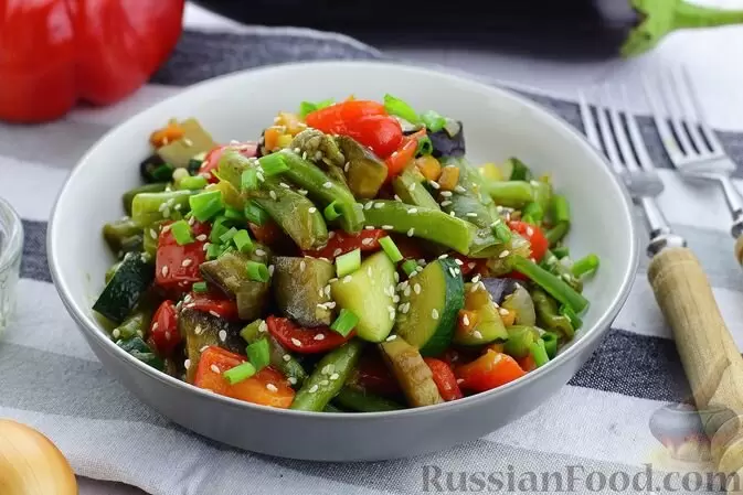 Овощное рагу из баклажанов, цукини и стручковой фасоли радует глаз и вкус. Сочетание чеснока, имбиря и соевого соуса придаёт блюду уникальный аромат и вкус.