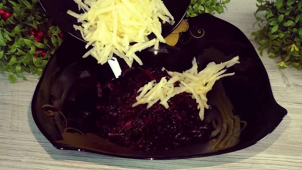 Чтобы начать, свёклу нужно заранее отварить или запечь. После охлаждения, свёклу следует натереть на крупной тёрке и поместить в миску. Туда же добавить натёртое яблоко в таком же количестве, а также выдавить чеснок. Следующим шагом станет добавление грецких орехов, предварительно измельчённых по вашему вкусу.