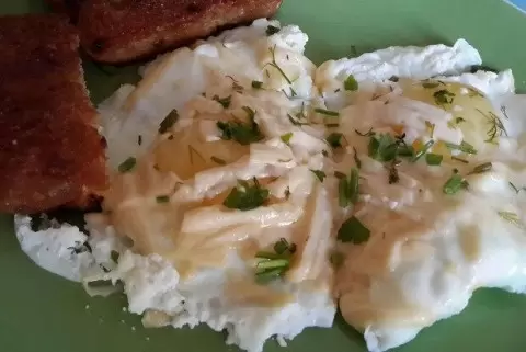 Эта яичница становится невероятно мягкой и насыщенной на вкус благодаря сметане. Попробуйте, и ваши близкие оценят этот кулинарный шедевр!