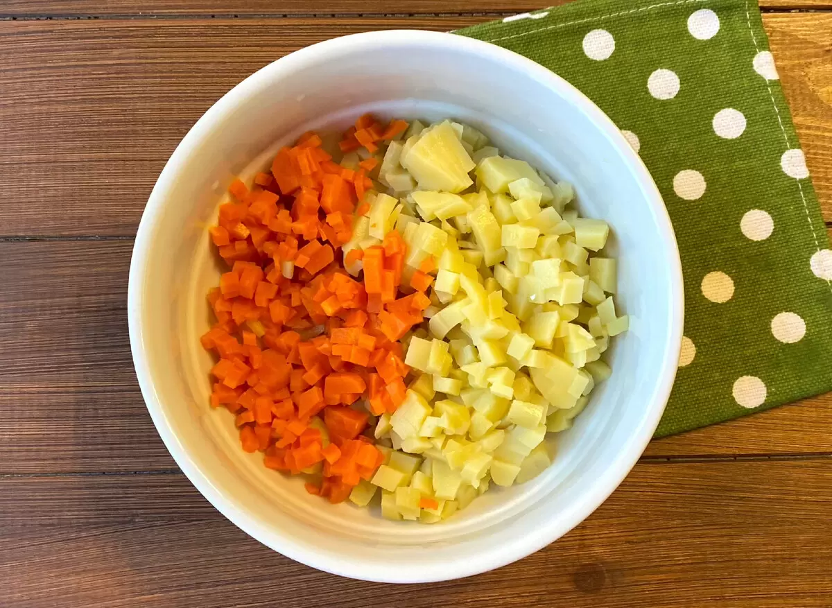 Собирая ингредиенты, нарезаем картофель и морковь на небольшие кубики, а затем выложим их в салатник. Дальше нарезанные на кусочки куриная печень и яйца добавляются в общую массу. В этом варианте можно заменить куриную печенку на говяжью или свиную — это придаст салату дополнительные акценты. К этому добавляют консервированный горошек и заранее нарезанные соленые или маринованные огурцы.