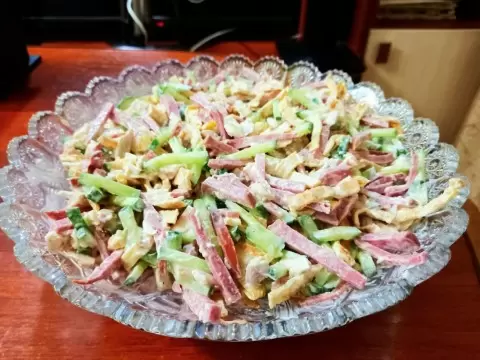 - 250 граммов сервелата, нарезанного соломкой;