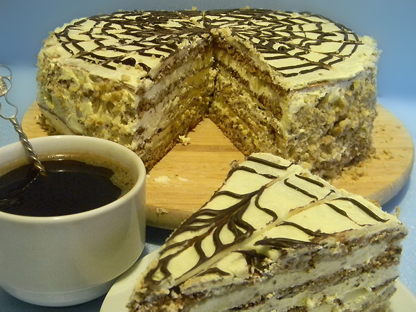 Соберите торт, чередуя коржи и крем. В качестве завершения верхний корж намажьте джемом (например, лимонным). Обмажьте торт оставшимся кремом, затем приготовьте глазурь, растопив белый и темный шоколад. Украсить можно как миндальными лепестками, так и дроблеными орехами.