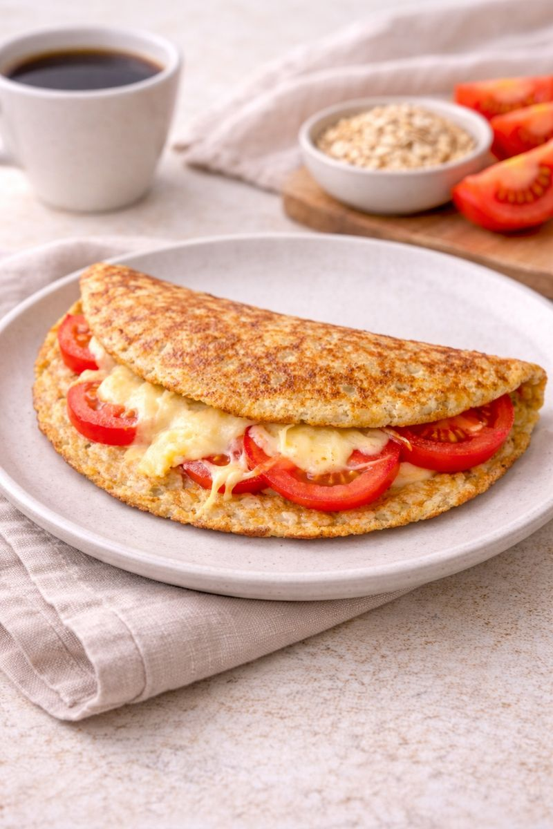 Получается румяный овсяноблин с тянущимся сыром и сочными помидорами. Этого вполне хватает, чтобы избежать перекусов печеньем или другой не самой полезной едой.