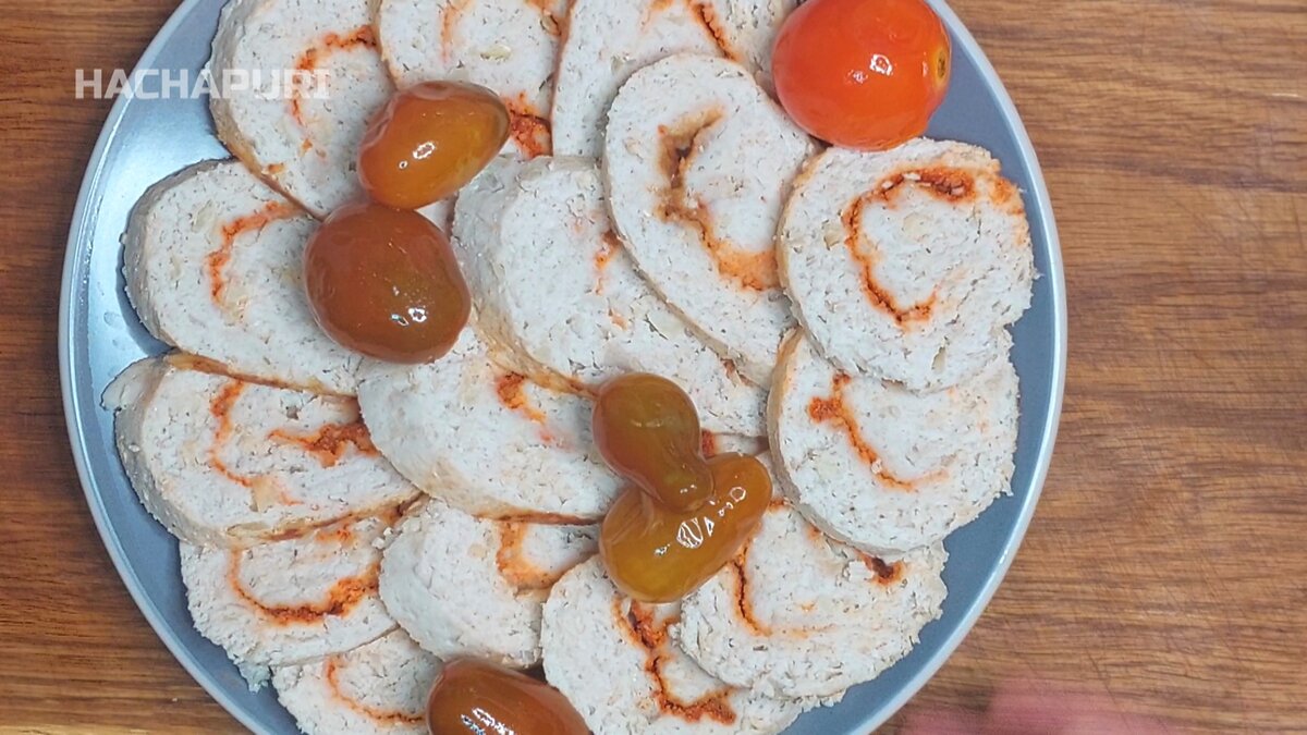 После того как масса равномерно распределена, следует аккуратно завернуть ее в рулет, плотно завязывая края пленки. Далее в кастрюле доводится вода до кипения, после чего колбаса помещается в кипяток на 20-25 минут. После варки, для получения румяной корочки, можно обжарить колбасу с обеих сторон на сковороде.