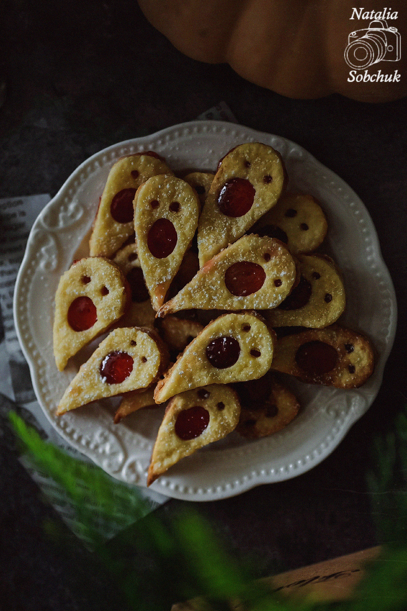 Чтобы создать завершенный образ, нижнюю часть печенья рекомендуется намазать клубничным джемом и укрыть сверху печеньем с отверстиями, напоминающими окошки привидений. При желании, для более эффектного вида, можно посыпать сахарной пудрой.
